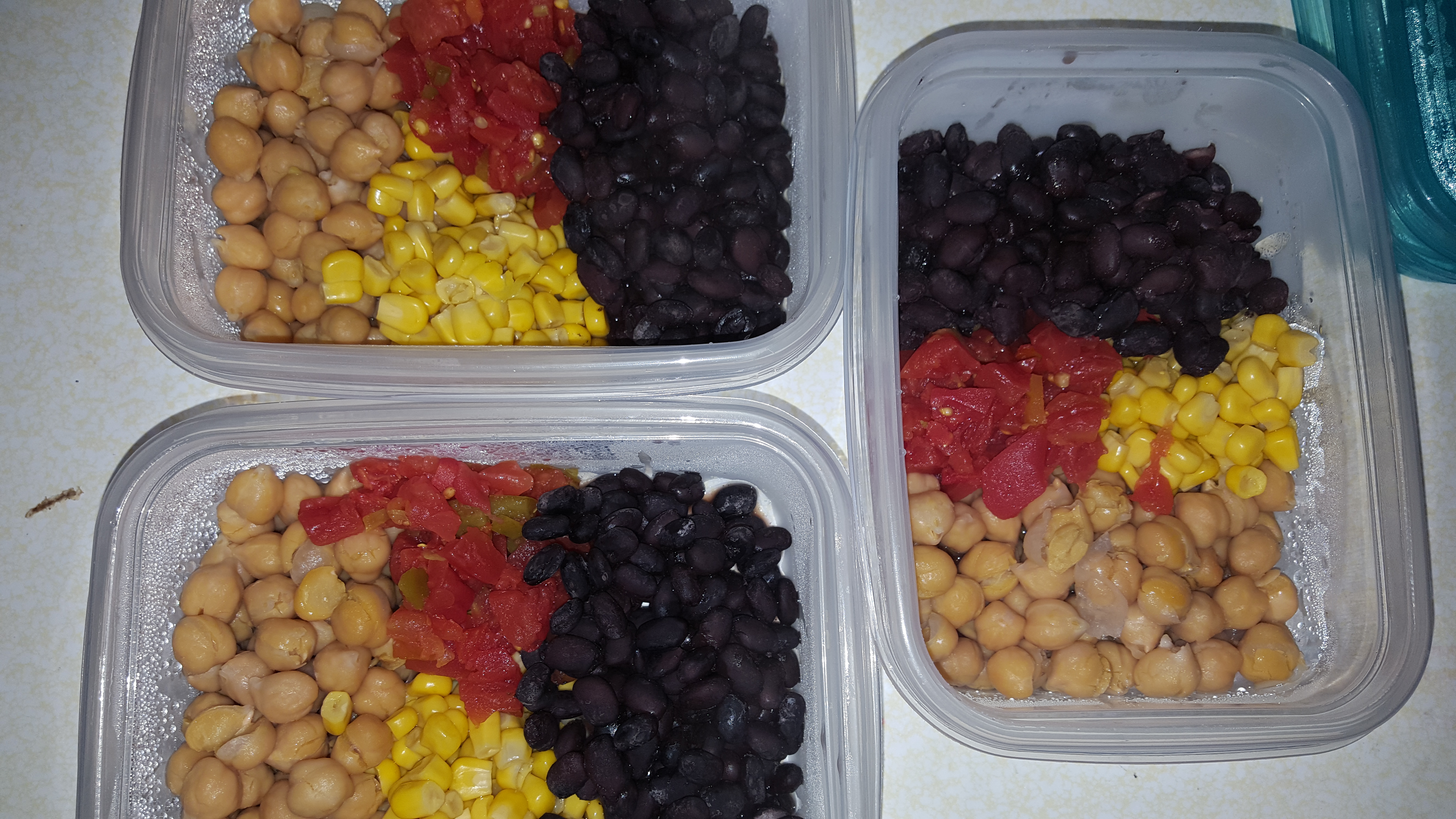 I divided the beans in three different Tupperwares, and added canned corn and tomato.